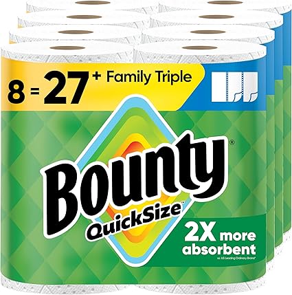 - FAMILY TRIPLE ROLLS: Each pack contains 8 Family Triple Rolls of Bounty white Quick-Size paper towels, equivalent to 27+ regular rolls, ensuring you’re well-stocked for all your cleaning needs.