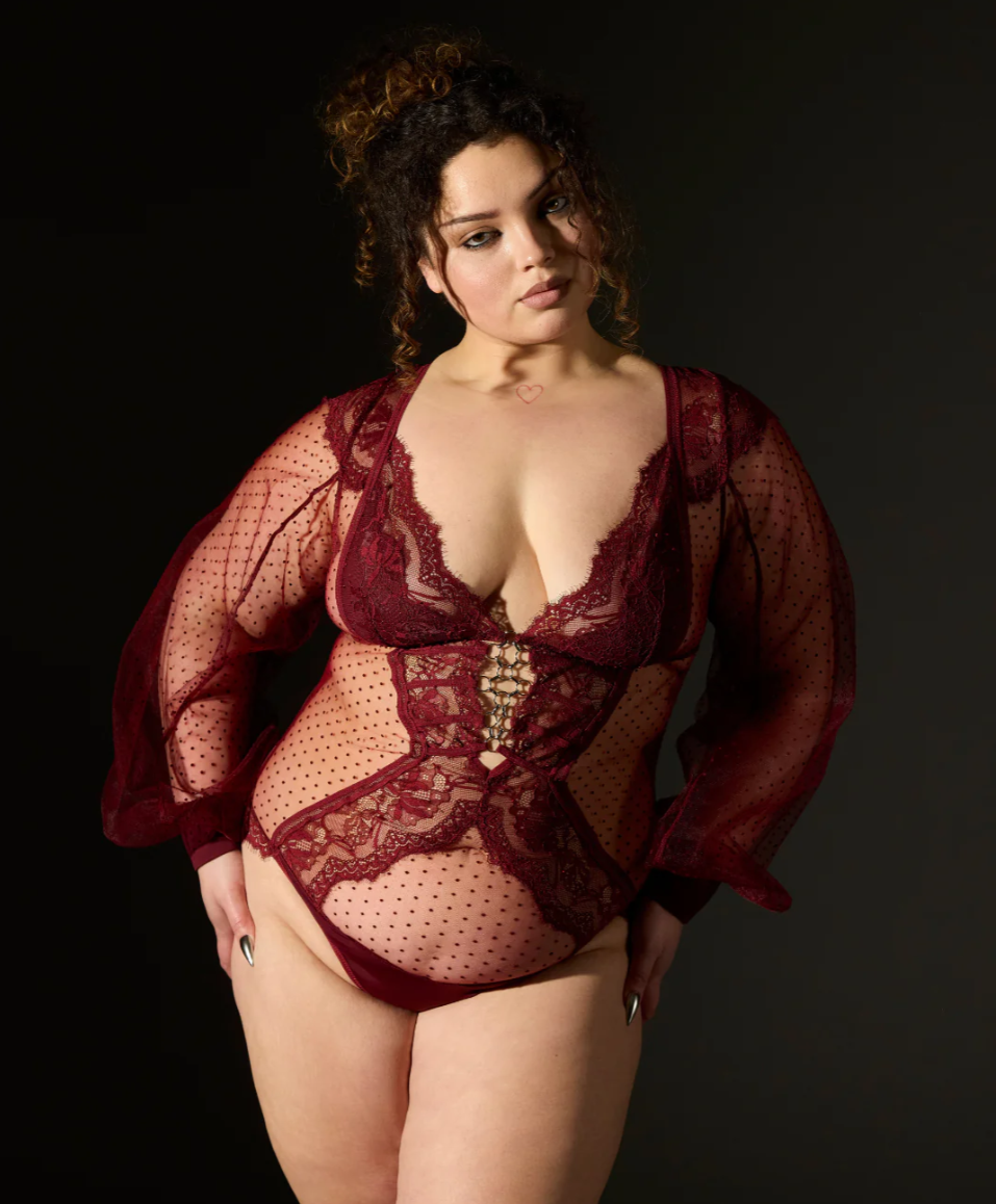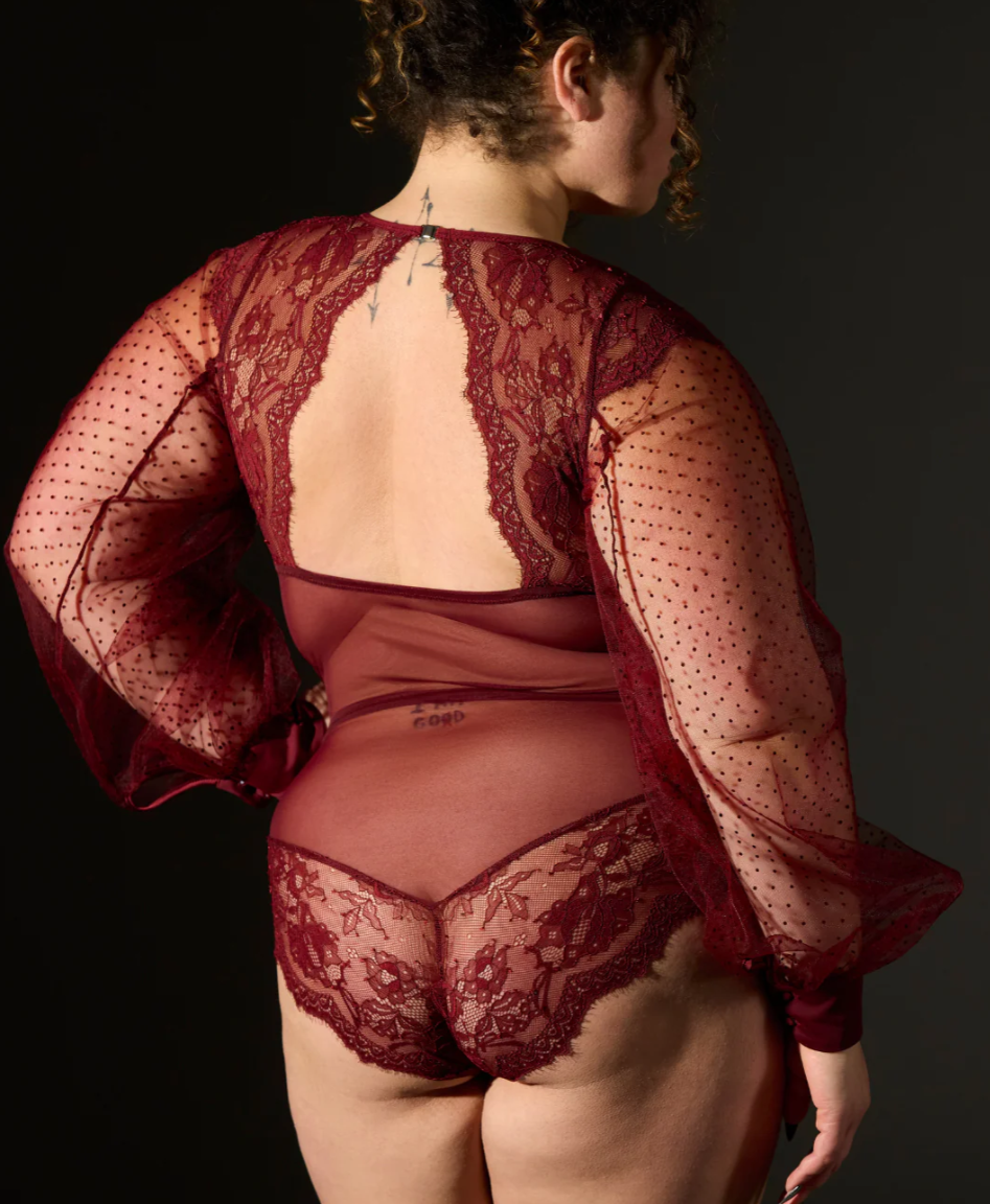 Lace appliquéd bodysuit with nickel free interlocking metal rings, Point d’Esprit tulle sleeves, decadent trim and magnetic closures at center neck.